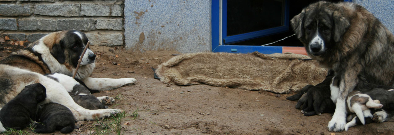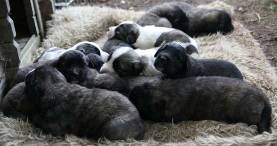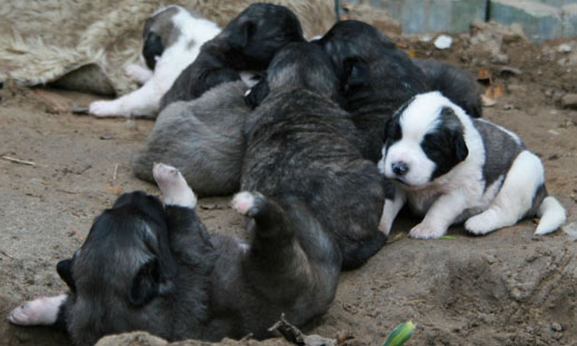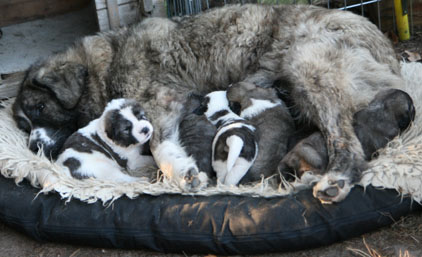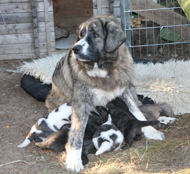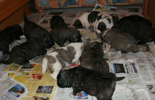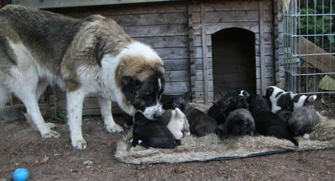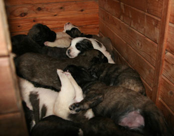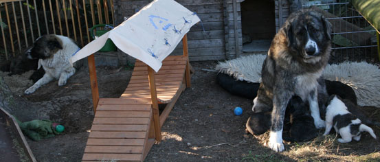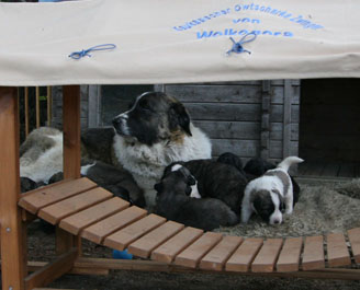 Halbschwester Aunja ist eine tatkräftige Unterstützung für Bulana. Sie hat ja schon unseren C-Wurf groß gezogen und ist nun eine sehr gute Amme, die sogar Milch hat. Aunja und Bulana sind die besten Freundinnen und daher gibt Bulana auch mal ein paar Welpen ab. Sind ja schließlich auch genug für alle da :-)