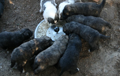 Die Welpen sind jetzt auch schon mal öfter in ihrem Welpengarten und fressen einen Brei aus dem Napf. Danach müssen Mama und Amme kräftig putzen :-)
